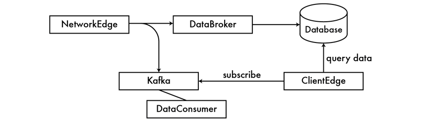 The dataflow within Conductor is pictured above. Users can implement the ClientEdge API to query/send data or to establish a subscription for "real-time" data exchange. Conductor uses Apache Kafka to broker publish-subscribe messaging.