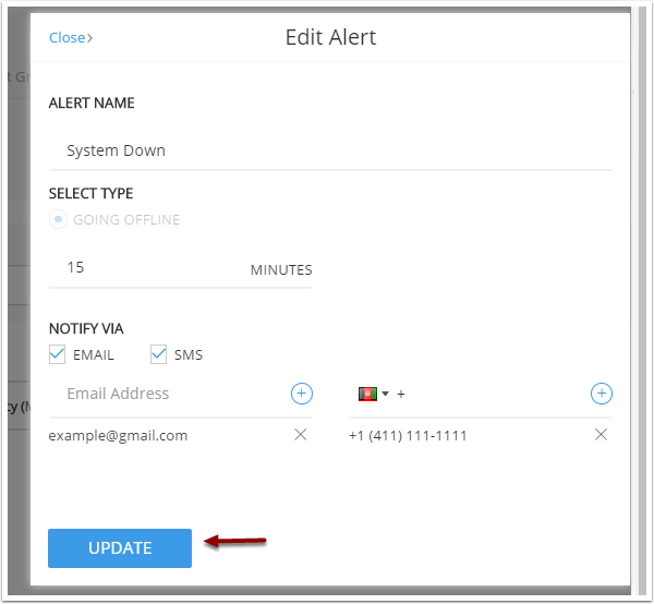 Name the Alert and choose a notification option. It is possible to alert multiple email and phone numbers.