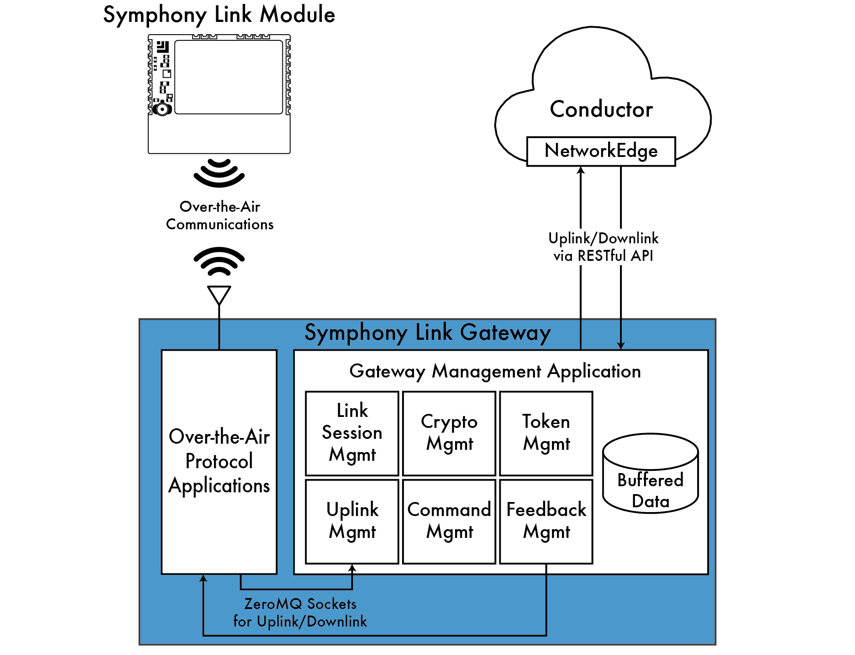 The connection between a Symphony Link gateway and Conductor is made between the Gateway Management Applications (which runs locally on the gateway) and the NetworkEdge (which runs in Conductor). The gateway uses the NetworkEdge RESTful API to send uplink data and to poll for downlink data.