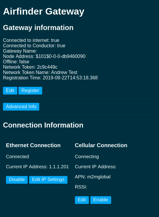 On the connected PC, open a browser and navigate to 192.168.3.3 . The Gateway UI will appear providing an interface to view the status of the gateway, to connect it to the Internet, and to register the gateway with a Conductor account.