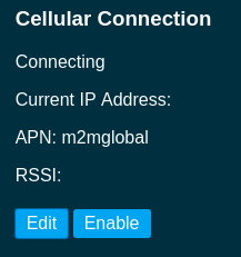 The cellular-enabled model of the indoor gateway (LL-BST-8-915-SYM-G-I-US) includes a cellular modem. To use cellular option, first insert a SIM card in the gateway. In the Cellular Connection area click the Edit button and enter the APN, Number, and APN Username, and APN Password. Click Save Changes. In the Cellular Connection area, select the Enable button.