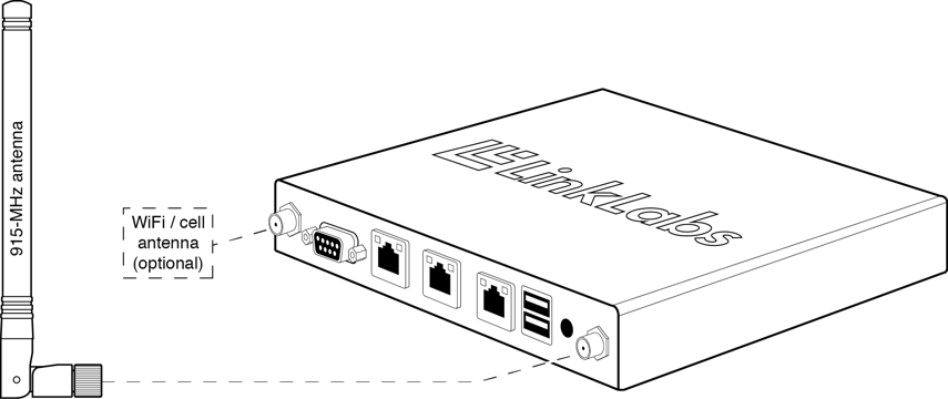 Connect the 915-MHz antenna to the gateway's UHF antenna jack. Connect the WiFi or cellular antenna to the WiFi or Cell jack (for WiFi / cell enabled models only).