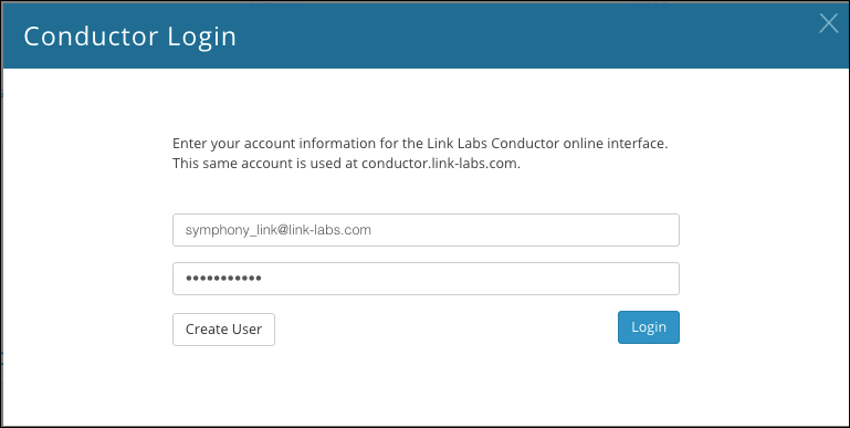 The Conductor Login prompt appears. Enter your credentials and click the Login button. Or, if you do not have a Conductor account, click the Create User button and follow the directions to make an account.