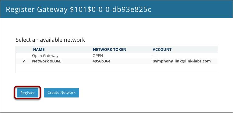 In this example, we're going to register the gateway with a new Symphony Link Network. (But if you want, you can simply register the gateway with the Open Gateway network.) Click the Create Network button.