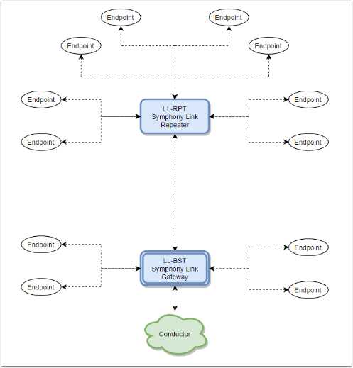 Without repeaters, the Symphony Link network is a pure star topology. Inserting a repeater introductes a "single hop" into the topology. That is to say, a Symphony Link module can communicate with a Symphony Link gateway through at most one Symphony Link repeater.