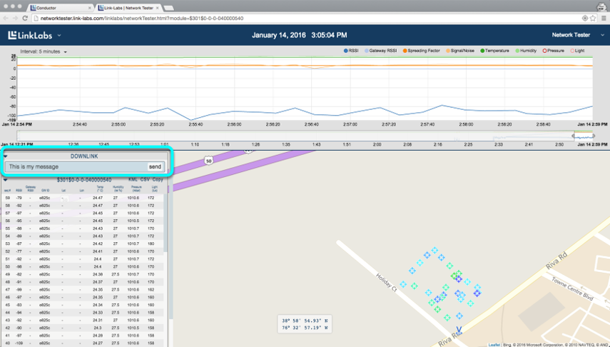 Enter a message into the DOWNLINK edit box on the network tester webpage and click send.