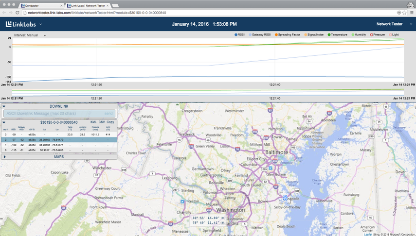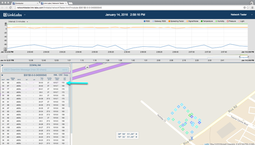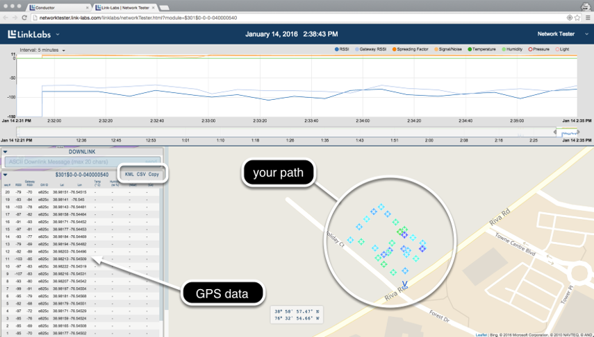 When you have finished walking around, take a look at the network tester webpage. The GPS coordinates of each transmission are recorded on the map in the main window, color coded to represent the connection strength. They show the path you just walked.
