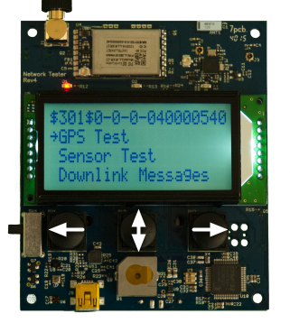Toggle to and select Mode. Repeatedly selecting Mode will cycle through the available GPS reporting modes. Set the mode to 10s, so the network tester reports its GPS coordinates once every 10 seconds. The D2 diode (the middle one) lights up and the network tester beeps every time it transmits.