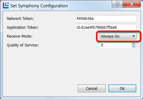 From Prelude's Options menu, select Set Symphony Config. Set the Receive Mode dropdown to Always On. Click OK.