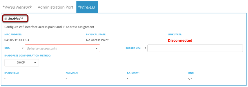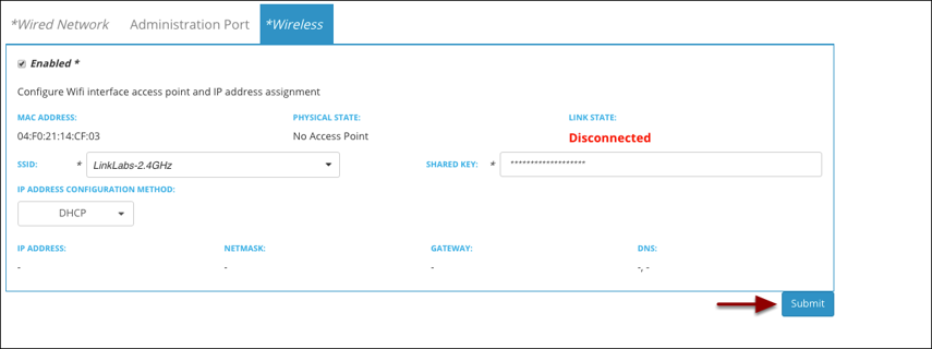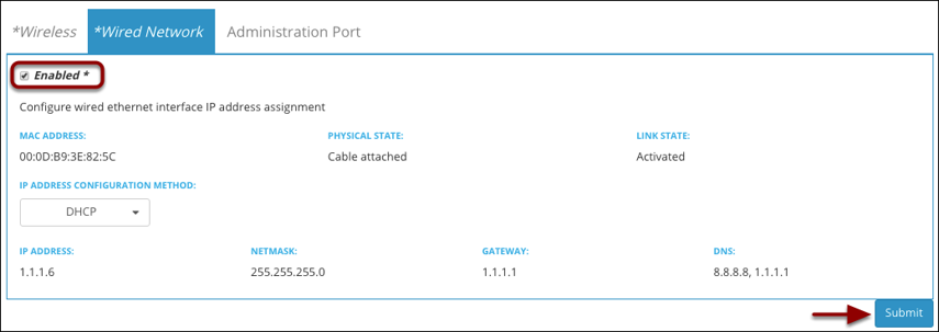 In the Wired Network tab, select the Enabled checkbox. Click Submit.