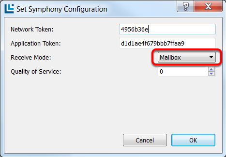 From Prelude's Options menu, select Set Symphony Config. Set the Receive Mode dropdown to Mailbox. Click OK.