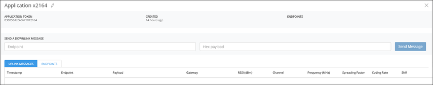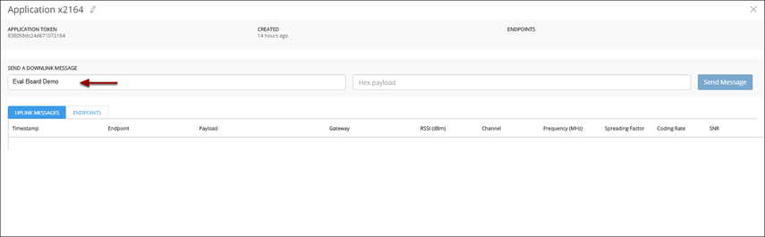 Using the Select an endpoint dropdown, select the UUID of the Symphony Link Module on your evaluation board. Enter a hex-string message in the Hex payload editbox, like "4321". Press Send Message.